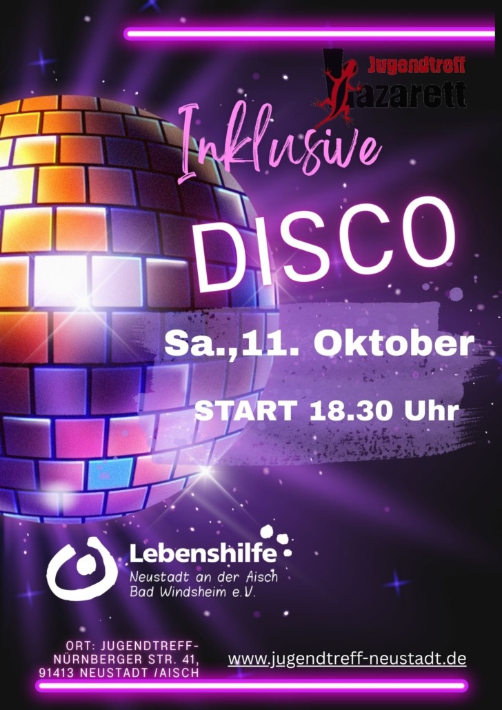 Die Inklusive Disco ist ein offenes Angebot, das heißt, du kannst einfach vorbeikommen und musst dich nicht anmelden. Brauchst du eine individuelle Betreuung, melde dich bitte vorher bei den Offenen Hilfen. Telefon: 09841/68251920. Die Disco beginnt um 18.30 Uhr und endet gegen 21.30 Uhr